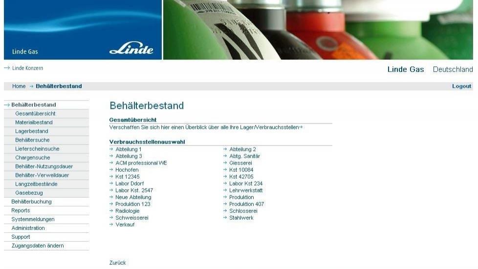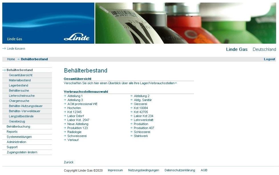 der Kunde kann sich im Webportal eigene interne Organisationseinheiten/Verbrauchsstellen definieren, und die von Linde erhaltenen Behälter innerhalb seiner eigenen Firmenstruktur unterverteilen, optional kann dies auch über einen mobilen Barcode-Scanner erfolgen