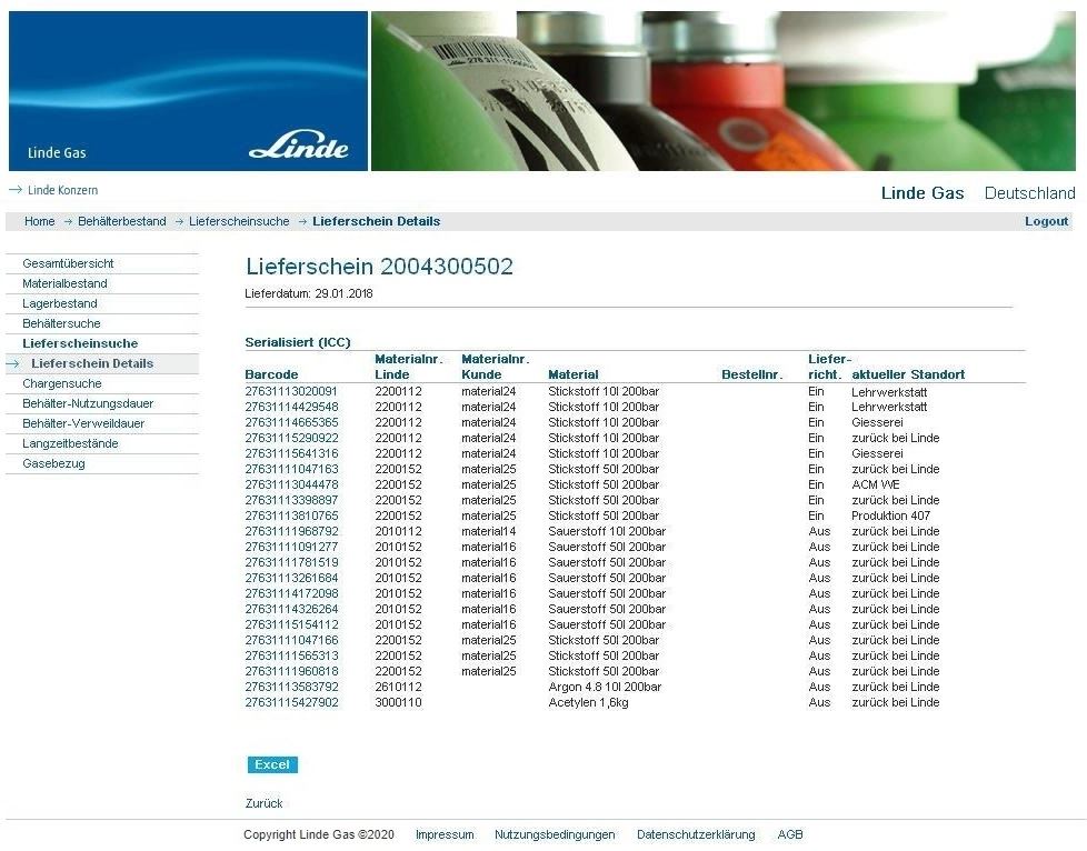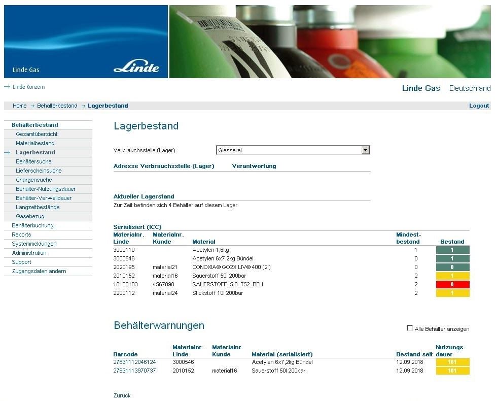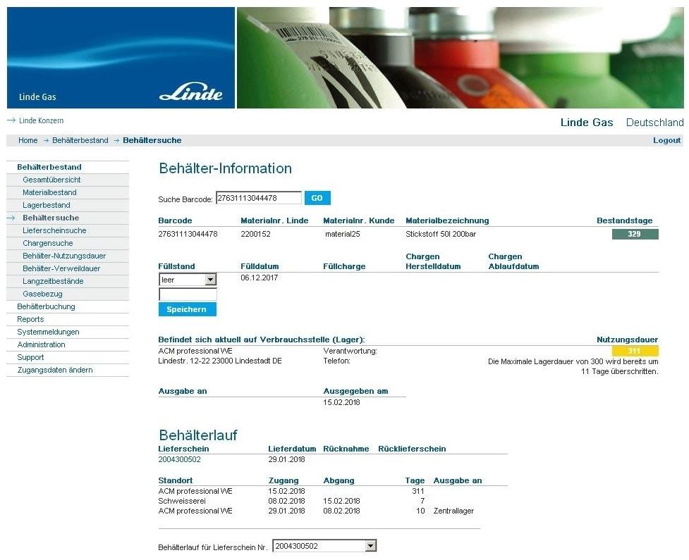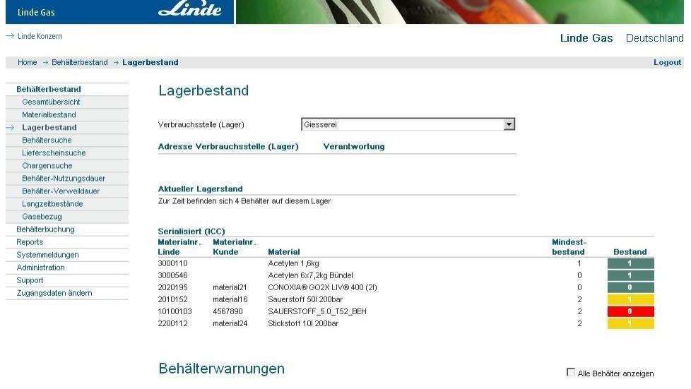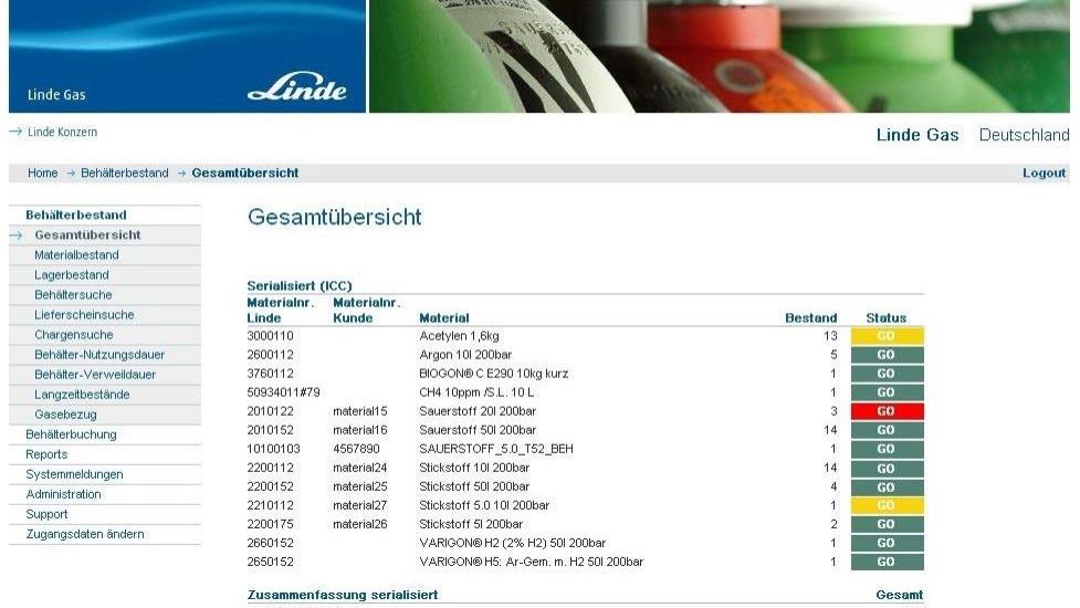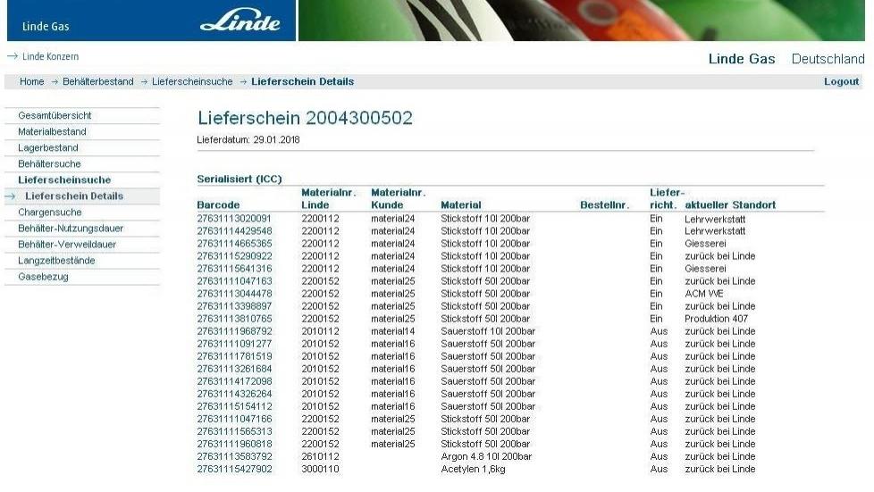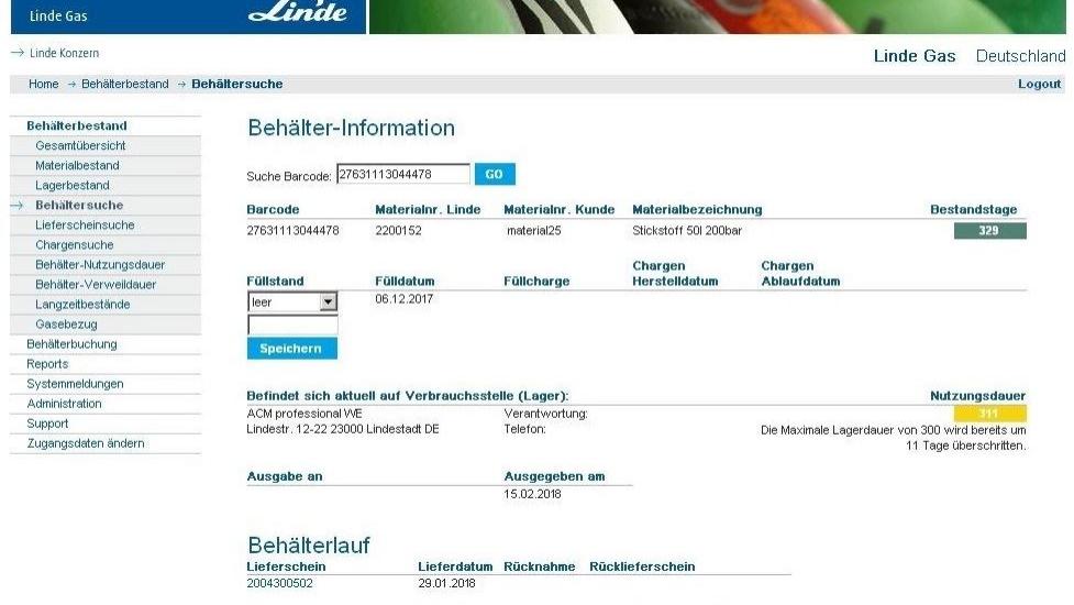 der Kunde kann jederzeit seinen aktuellen Bestand an Gasen und Behältern einsehen oder ältere Lieferscheine und Daten abrufen