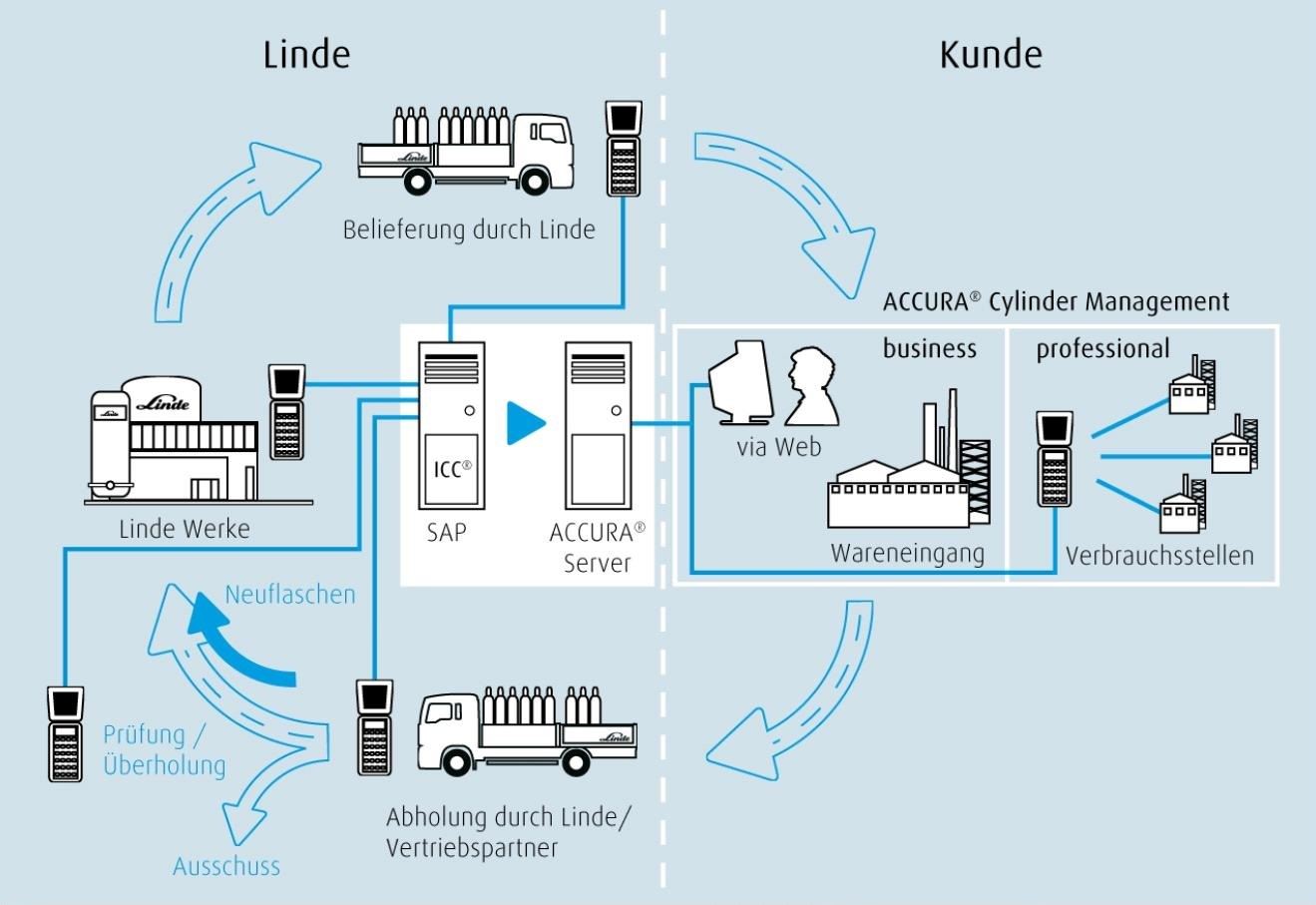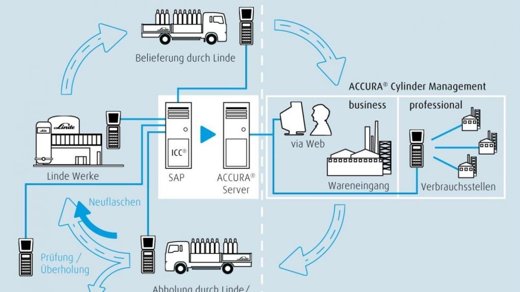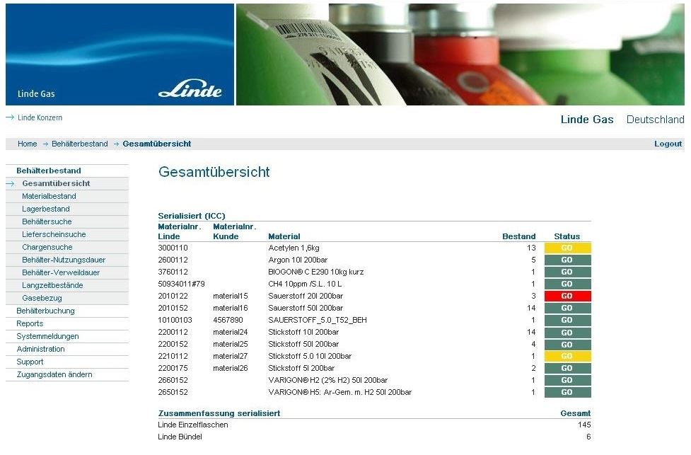 Mit dieser Anwendung können Kunden von Linde Gas über ein Internet-Portal ihre gelieferten Gaszylinder verfolgen und mittels optionalen Barcode-Scanners auf ihre eigenen selbstdefinierten Lager unterverteilen.