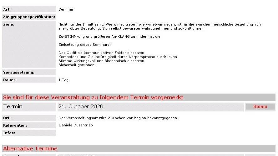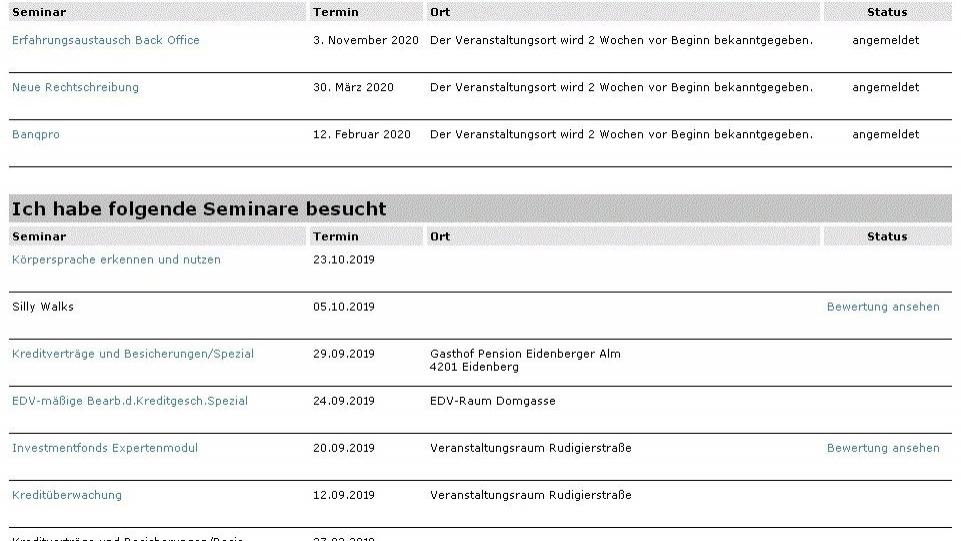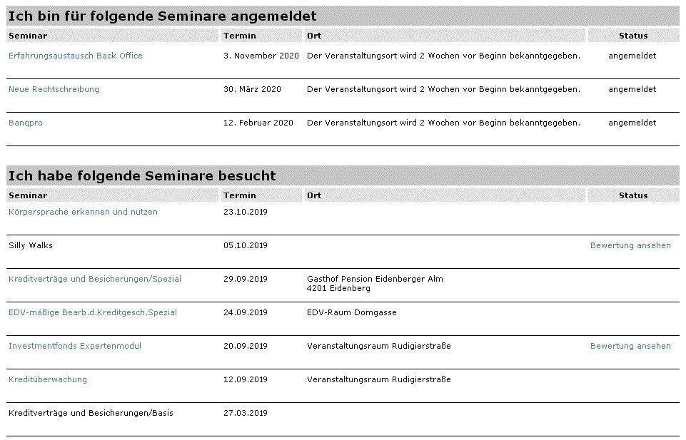 Anzeige des Seminarangebotes im bankinternen Intranet, Anmeldung der Mitarbeiter über das Intranet zu den Veranstaltungen, Genehmigung/Ablehnung der Anmeldungen durch die jeweiligen Vorgesetzen der Mitarbeiter