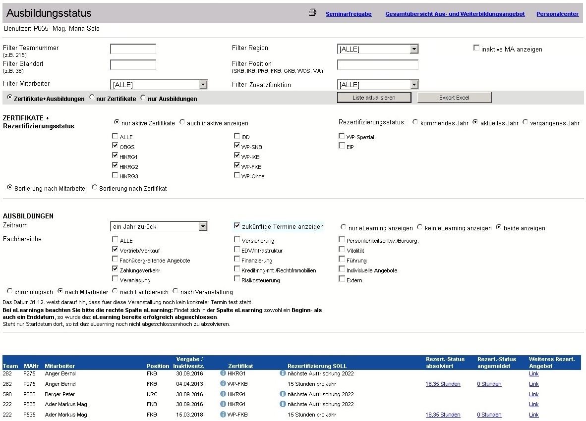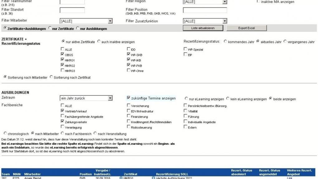 ständige Abfragemöglichkeit im Intranet der vollständigen aktuellen Ausbildungshistorie aller Mitarbeiter, auch zur Einsichtnahme für Vorgesetzte (Seminare, Schulbildung, universitärer Ausbildung, Zertifizierungen etc.)